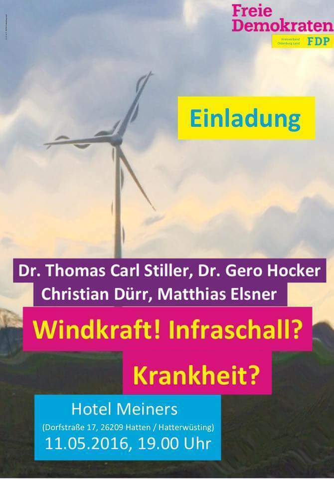 VORTRAG: FDP veranstaltet Informationsabend zu „Infraschall“ bei Windkraftanlagen HATTERWÜSTING – Dass der geplante Windpark in Hatterwüsting vielen Anwohnern ein Dorn im Auge und in der Wissenschaft umstritten ist, spiegelte sich auch in der hohen