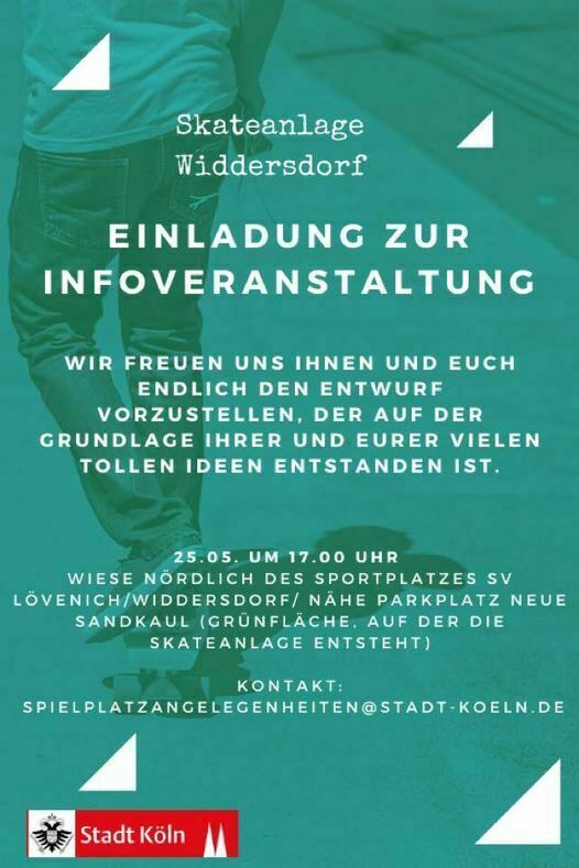Am 25. Mai um 17.00 Uhr lädt die Stadt Köln zur Infoveranstaltung in Widdersdorf ein (siehe Einladung). Dort werden die Entwürfe vorgestellt, die auf der Grundlage Eurer tollen Ideen entstanden sind. Treffpunkt ist die Wiese nördlich des Sportplatzes SV Löwi. Dort, wo die Skateranlage entsteht.