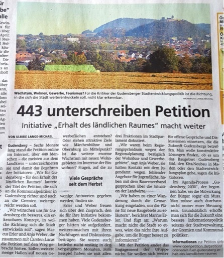 Die Petition „WIR FÜR GUDENSBERG - ERHALT DES LÄNDLICHEN RAUMES“ endet in kürze und wir bedanken uns bei allen UnterzeichnerInnen für die Unterstützung.