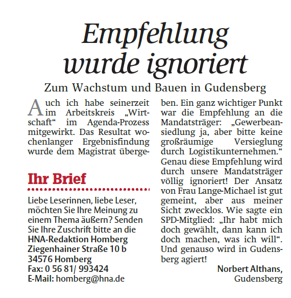 Ich möchte an dieser Stelle gern ALLE BürgerInnnen auffordern sich an den politischen Prozessen in Gudensberg zu beteiligen. Kommen Sie in die offenen Ausschusssitzungen und Stadtverordnetensitzungen. Hier haben die BürgerInnen nach der hessischen Gemeindeordnung ebenso das Wort !!