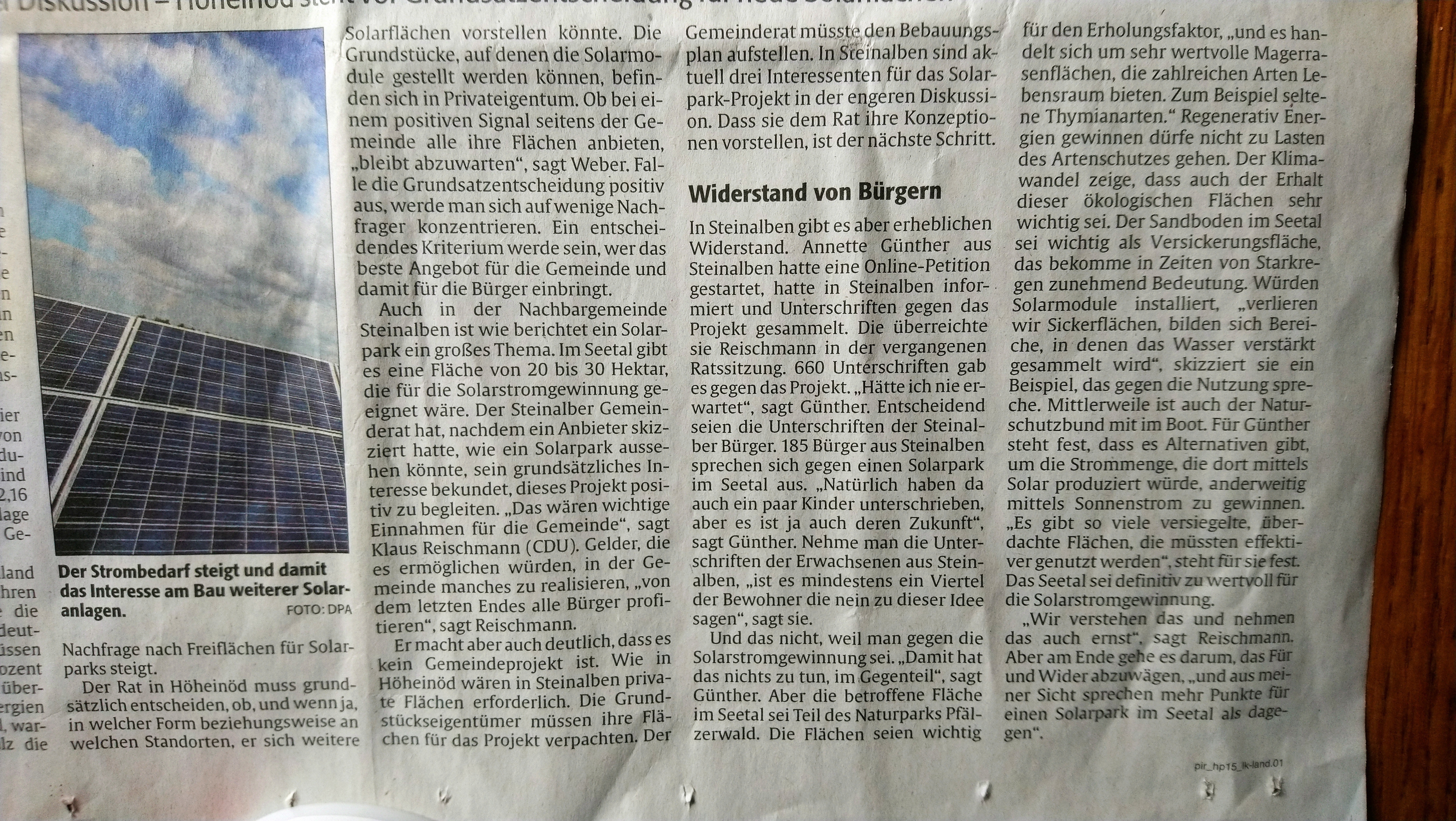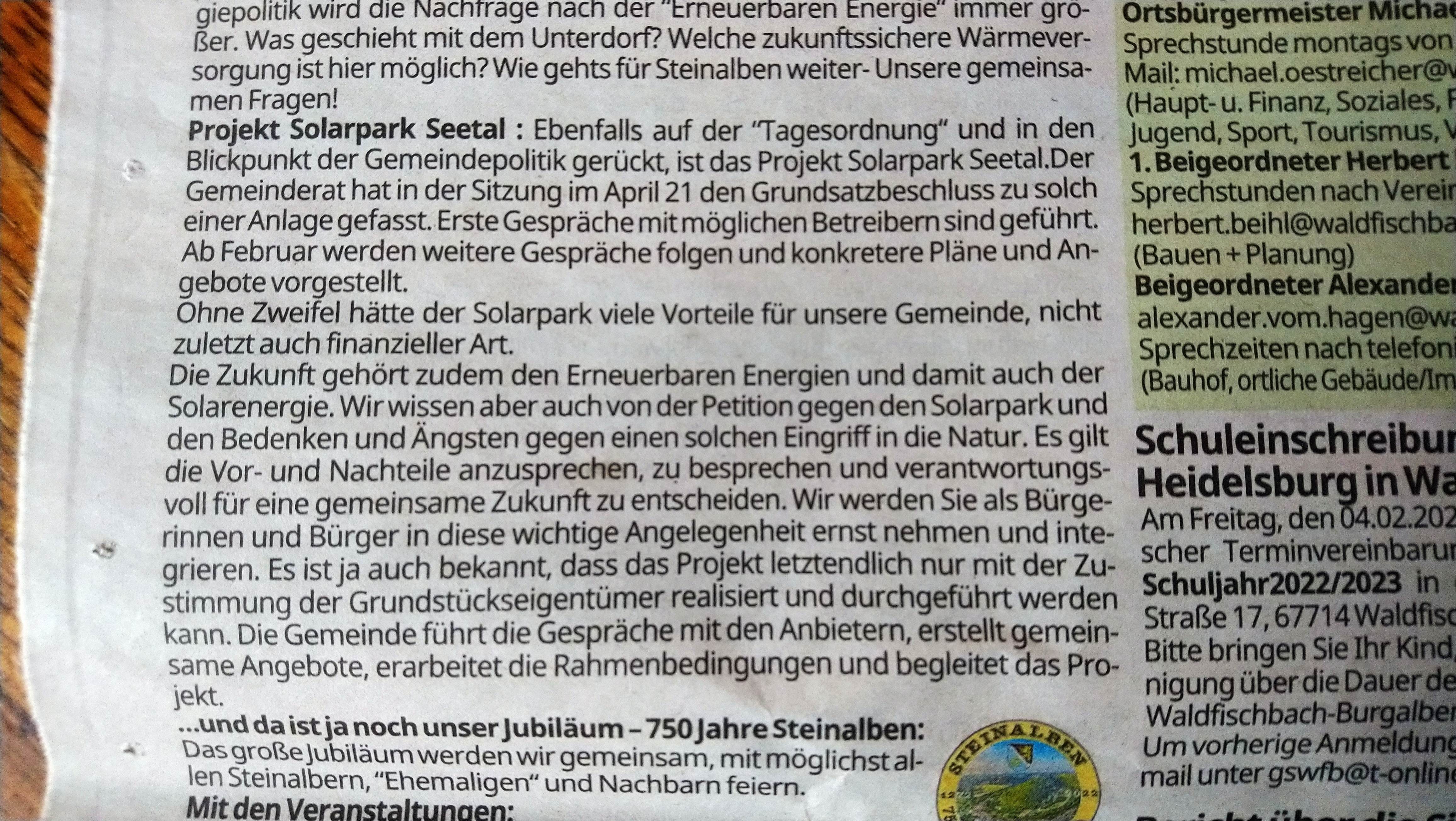letzten Dienstag war in der "Rheinpfalz" ein Artikel über das Vorhaben Solarstrom in Steinalben. So wie es dort heißt, hat der Steinalber Gemeinderat sein grundsätzliches Interesse bekundet, dieses Projekt positiv zu gegleiten. Der Bürgermeister Klaus Reischmann sagte: "Das wären wichtige Einnahmen für die Gemeinde. Aus seiner Sicht sprechen mehr Punkte für einen Solarpark im Seetal als dagegen."