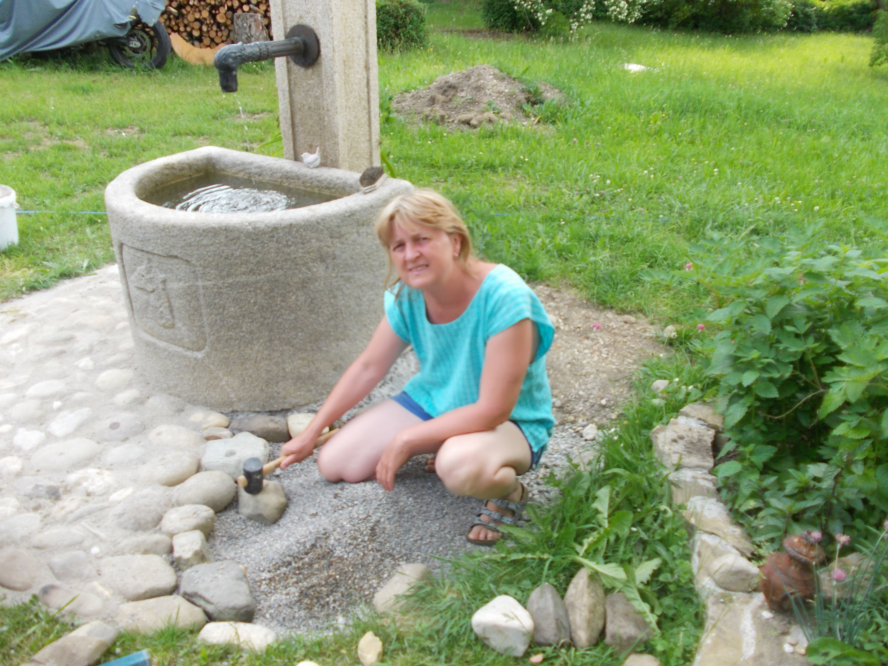 Seit einigen Jahren fließt nun das frische Hochbergwasser in Ellis schönen Brunnen. Hier seht ihr sie beim Pflastern der Umgebung. Immer wieder erleben wir, dass geplante Schritte nicht möglich werden, aber auch, dass Träume sich erfüllen. Manchmal heißt es sich fügen, andere Male verlangt es einen Einsatz.