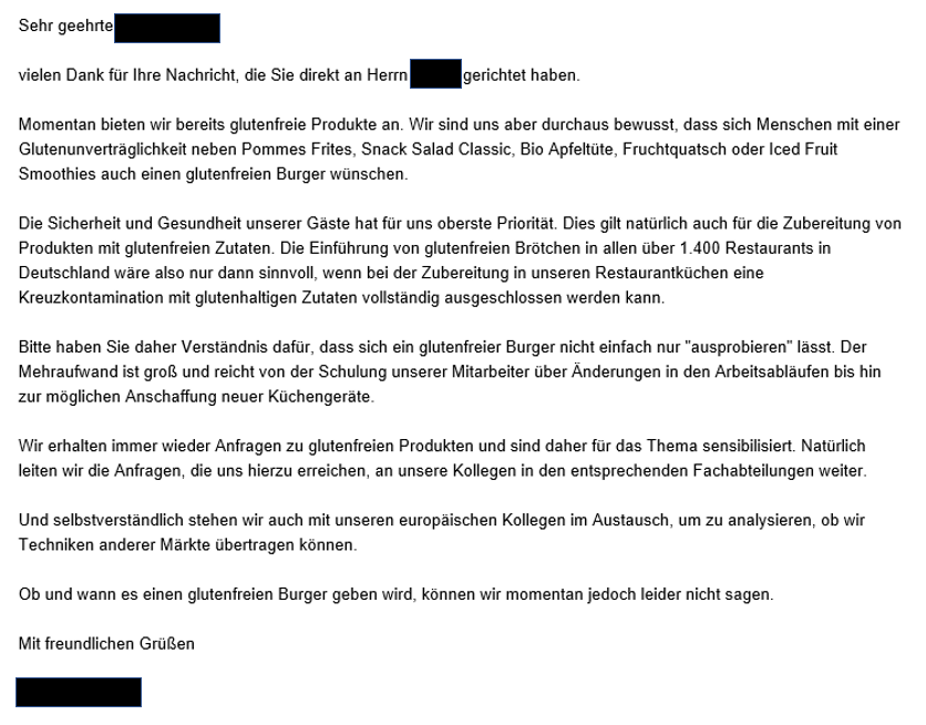 inzwischen haben wir Rückmeldung von McDonalds Deutschland bekommen. Wie bei den bisherigen Petitionen leider keine positive Rückmeldung. Aber immerhin mehr als die sonst übliche Standardabsage zum Thema glutenfreie Burger. Das Antwortschreiben findet ihr als Screenshot angehängt.