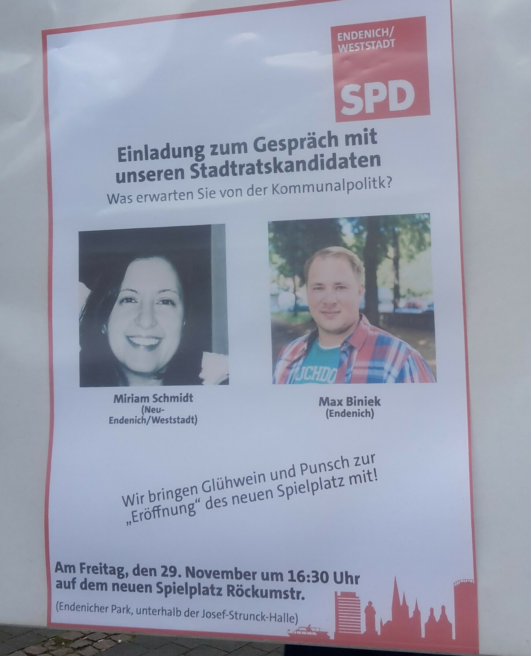morgen (!) 29.11. um 16:30 Uhr findet auf dem neu eröffneten Spielplatz im Endenicher Park ein Gespräch mit den Stadtratskandidaten der SPD statt. (Siehe Bild)