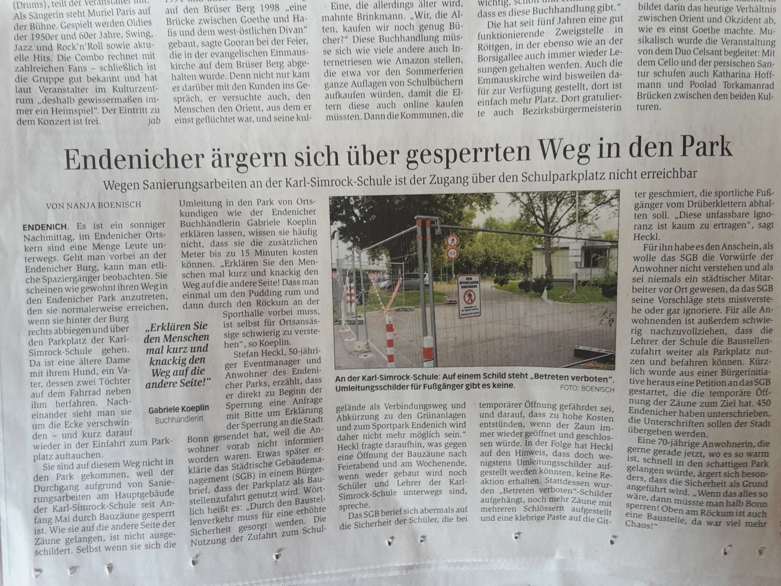 Über den Vororttermin mit verscheidenen Vertretern kann auch hier nachgelesen werden. www.spd-bonn-im-rat.de/2019/08/01/endenicher-park-weg-an-der-karl-simrock-schule-muss-gesperrt-bleiben/.