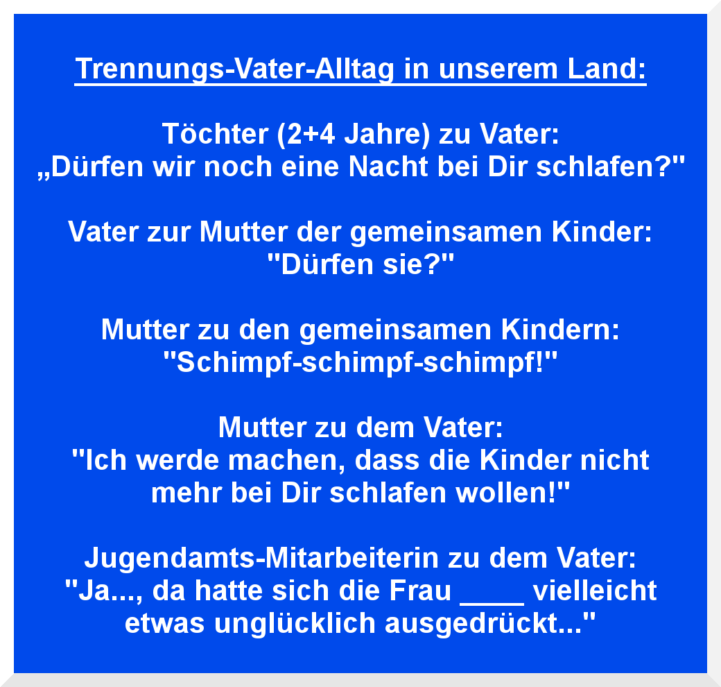 Auch darf der Staat gerne darüber nachdenken, nicht nur sowas wie den Unterhaltsvorschuß zu finanzieren, sondern vor allem ZEIT MIT DEN KINDERN finanziell zu fördern. Denn eigentlich sollen Elternteile nicht Unterhalt zahlen müssen, sondern Zeit mit den Kindern verbringen (dürfen)...