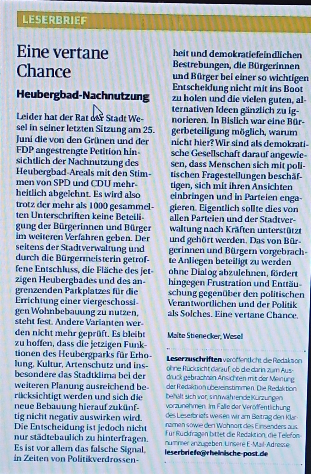 Für die Fläche des heutigen Heubergbads Wesel, der Heubergsauna und des angrenzenden Parkplatzes fordern wir:
