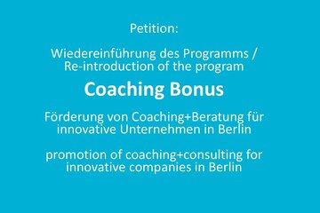 Dank Ihrer Spende kann openPetition noch mehr für die Petition "Re-introduction of the Berlin Coaching BONUS program of IBB" tun.